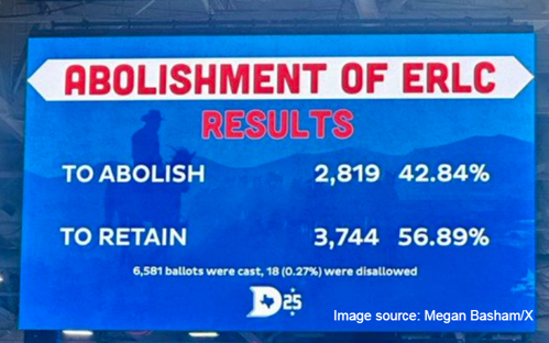 That is also why the ERLC has been targeted for termination at the annual SBC convention, most recently in June of this year, when it survived thanks to a 57%-43% vote to maintain it. That percentage, although seemingly wide, was only a difference of 925 messenger votes of 6,581 ballots that were cast. Approximately 3,000 messengers did not cast a vote.