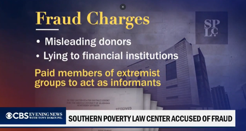 The segment also includes footage from the violent "Unite the Right" rally in 2017. That footage was shown because CBS viewers saw a page from the indictment, flashed on the screen, in which the DOJ alleges a person known as "F-37" helped organize that event and was on the SPLC payroll at the time.