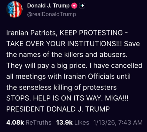 In a social media post to “Iranian Patriots,” posted Jan. 13, President Donald Trump told protesting Iranians to “TAKE OVER YOUR INSTITUTIONS.”